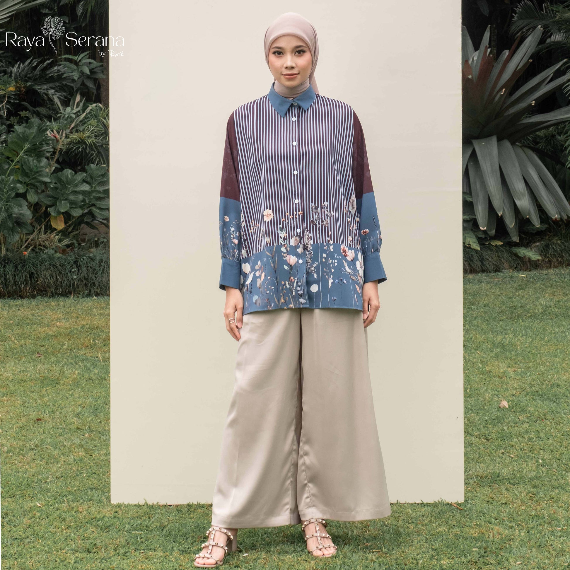 Terdapat print motif bunga dan stripe